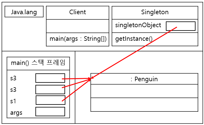 - 단일 객체 참조 변수를 정적 속성으로 갖는다