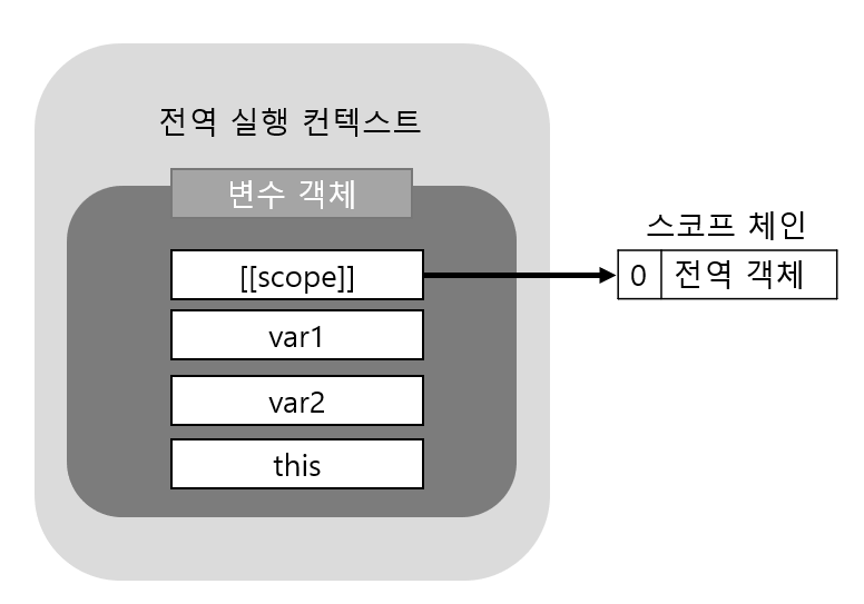 - 스코프 체인 = 현재 실행 컨텍스트의 변수 객체 + 상위 컨텍스트의 스코프 체인