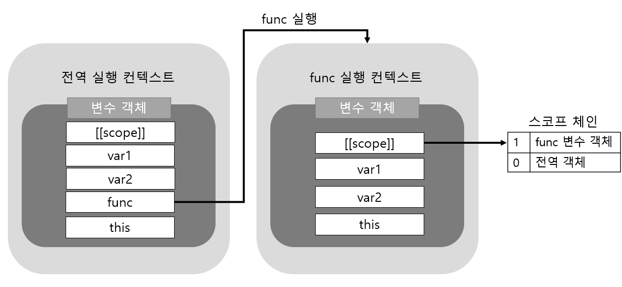 => 그리고 func 함수를 실행하면 새로운 func 컨텍스트가 만들어지고, 해당 컨텍스트의 스코프 체인은 실행된 함수의 [[scope]] 프로퍼티를 그대로 복사한 후, 현재 생성된 변수 객체를 복사한 스코프 체인의 맨 앞에 추가한다.