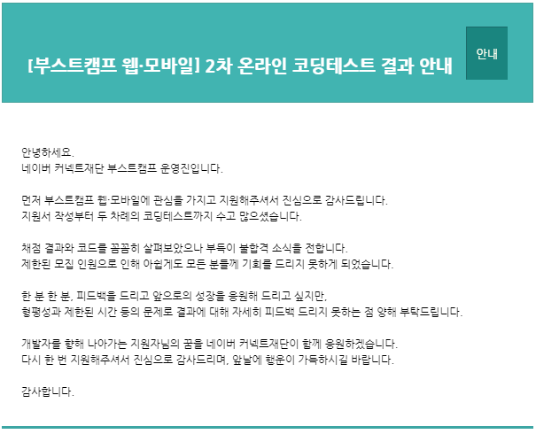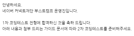 1차 결과 발표일 오후 2시쯤 1차 코딩테스트 결과 안내 메일이 왔다.